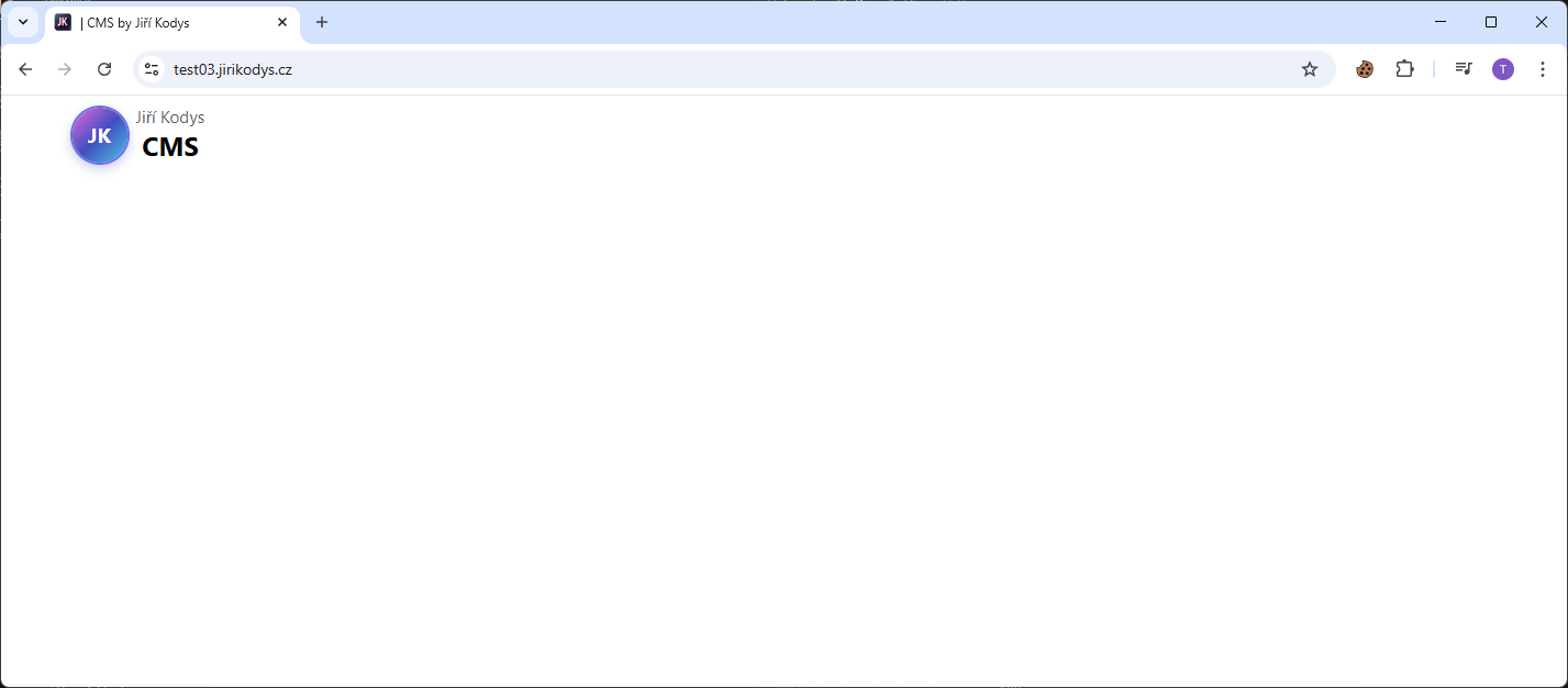 Po spuštění čistě nainstalovaného CMS zatím není vytvořen žádný obsah, takže se po otevření webu zobrazí prázdná stránka s výchozím logem. Výsledek vypadá přibližně takto: