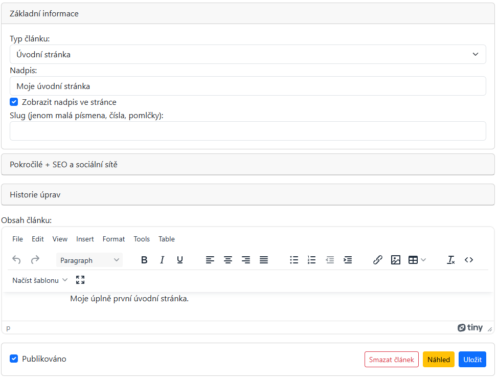 Pole Slug můžete zatím ponechat prázdné. Sekci Pokročilé není nutné nyní nastavovat, takže rovnou vyplňte obsah do pole Obsah článku.