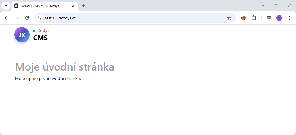 Po uložení a obnovení webu se nově vytvořená úvodní stránka zobrazí na svém místě.