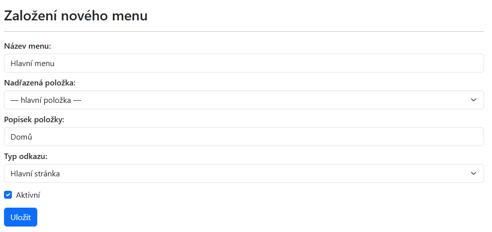 Typ odkazu nastavíme na Hlavní stránka a ověříme, že je zaškrtnuto Aktivní. Poté menu uložíme.